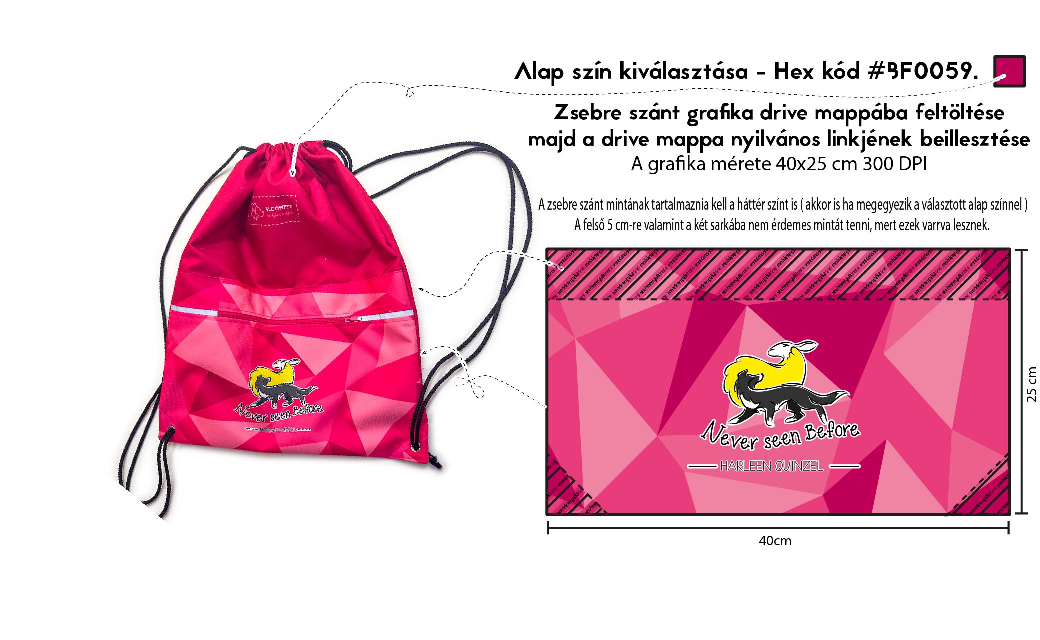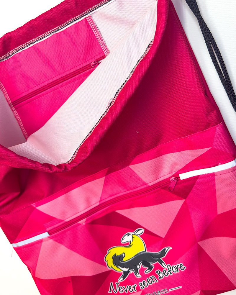 Az első részénél egy praktikus cipzáras zseb található, amit a Petpen egyedi mintájával díszítettünk. Ez az érdekes design egyedi megjelenést kölcsönöz a zsáknak, és kiemeli a többi közül. Ez nem csak egy egyszerű tornazsák, ez egy stílusos kiegészítő, amely kifejezi a személyiséged.