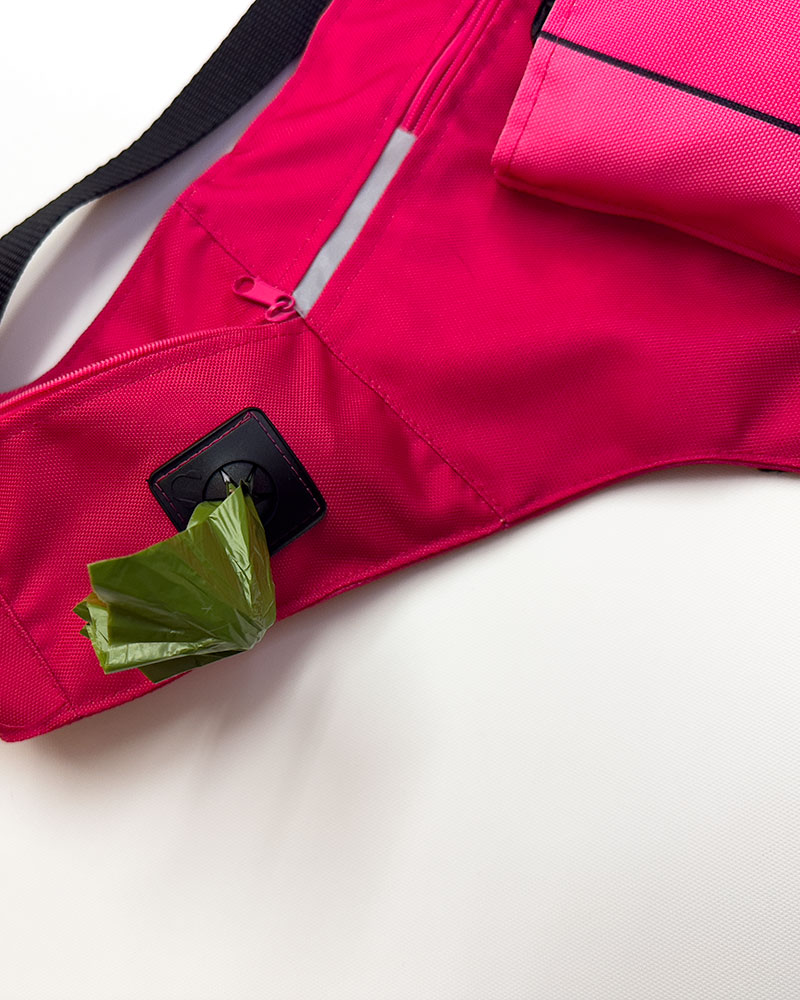 Az övtáska oldalán egy kakiszacsi tartó van, ami segít abban, hogy mindig legyen nálad zacskó, ha szükség van rá. A tartóból könnyen adagolható a zacskó, így nem kell bajlódnod vele.