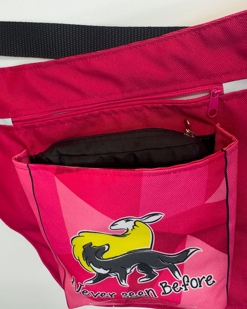 Az övtáska elején egy tépőzáras zseb található, ami könnyen nyitható és zárható. Ide teheted a jutalomfalatokat, amiket így mindig kéznél tudsz tartani. A zseb belseje mosható anyagból készült, így nem kell aggódnod a kosz és zsíros szennyeződések miatt.